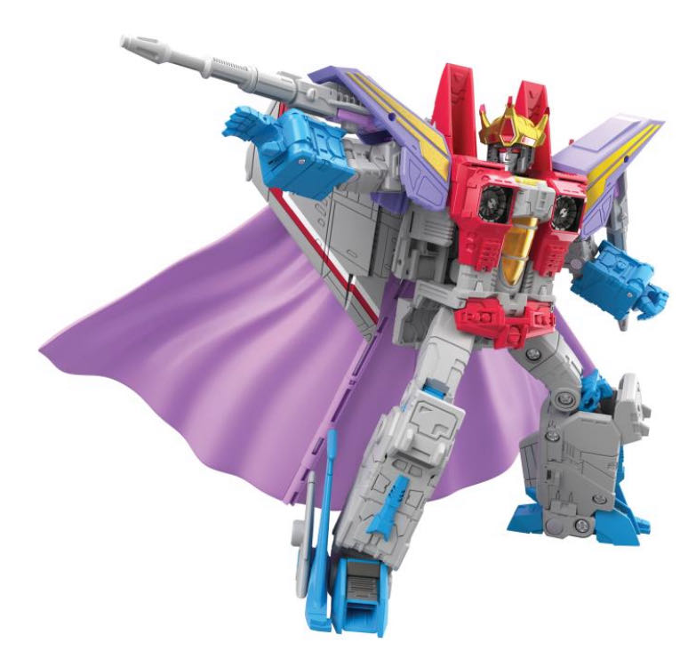 This Studio Series 86-12 Leader Class The Transformers: The Movie-inspired Coronation Starscream figure converts from robot to jet mode in 29 steps. Comes with 2 null rays, 2 shoulder armor pieces, crown, cape, and throne accessories. Remove backdrop to showcase the Coronation Starscream figure in the All Hail Starscream scene. In the All Hail Starscream scene, Starscream holds a coronation asserting his rise as king of the Decepticons, until Galvatron disrupts the proceedings and ruins his big day.