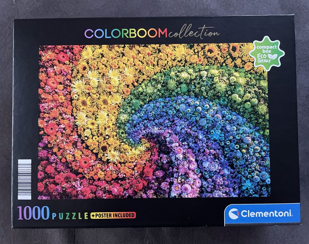 Clementoni Colorboom Collection Whirl 1000-piece jigsaw puzzle featuring a vibrant, swirling design of colorful flowers. This puzzle is designed for adults and puzzle enthusiasts who enjoy a challenge with its 1000 pieces.